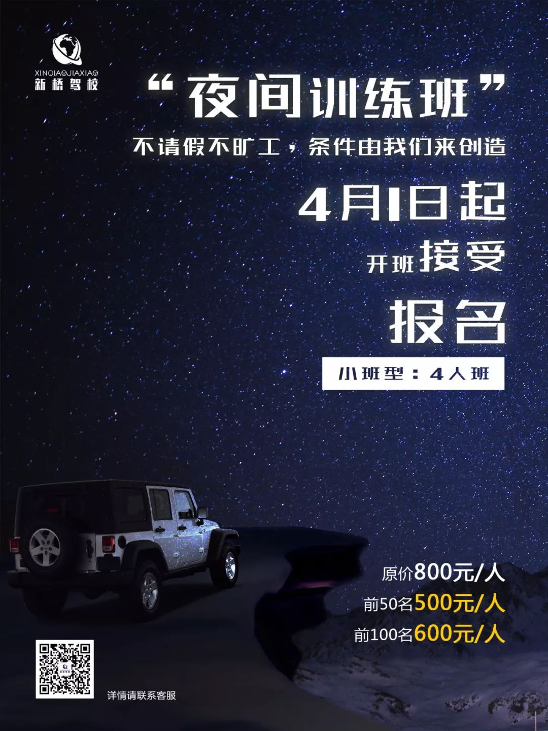 現(xiàn)在不用擔(dān)心了,新橋駕校特辟個(gè)性化服務(wù),專門為“朝九晚五”的上班族來學(xué)車開設(shè)了“夜間訓(xùn)練班”,讓想學(xué)車卻苦于時(shí)間有限的學(xué)員們擁有更多的選擇!
